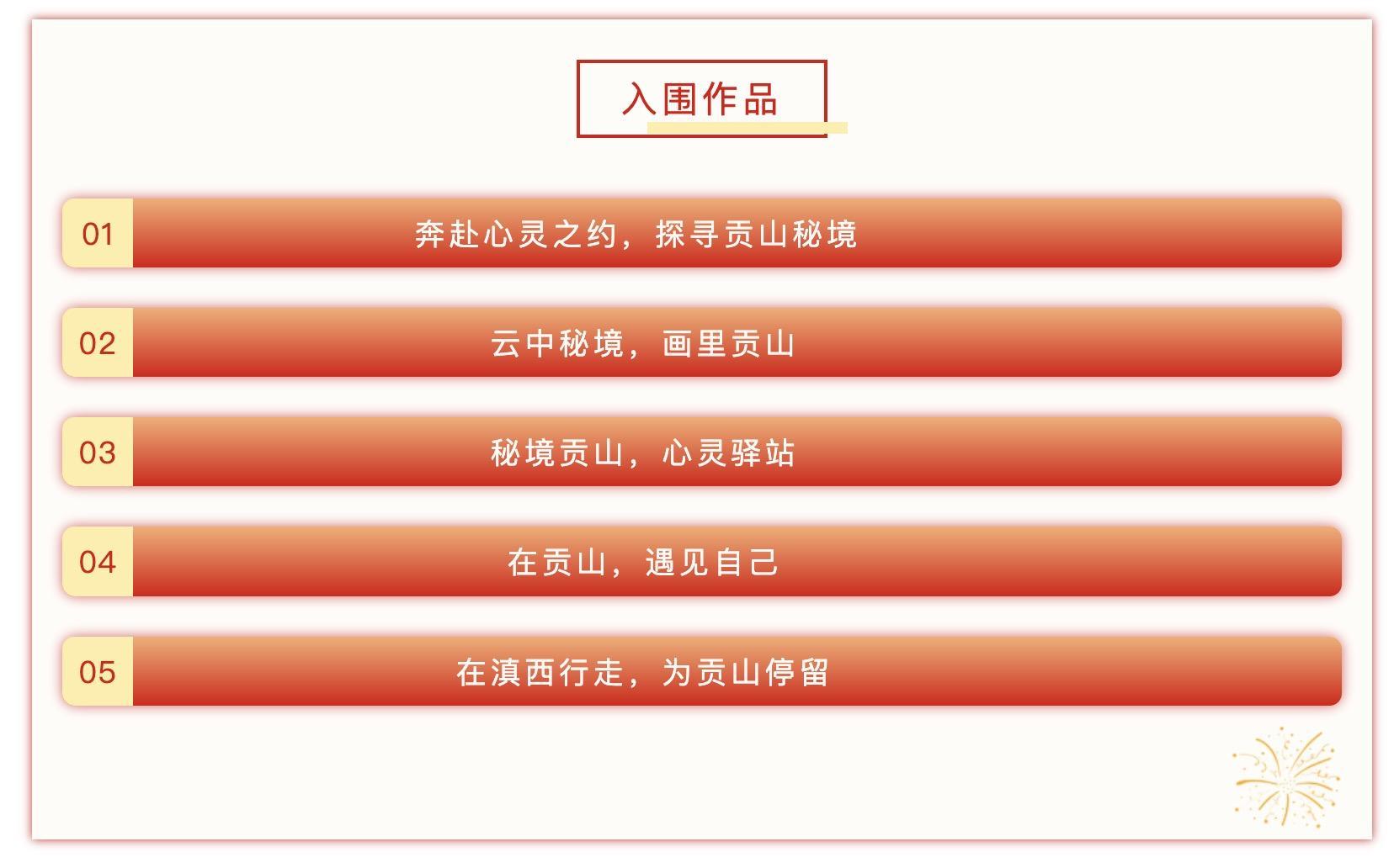 评选结果显示,入围作品中包含“在滇西行走,为贡山停留”宣传口号。